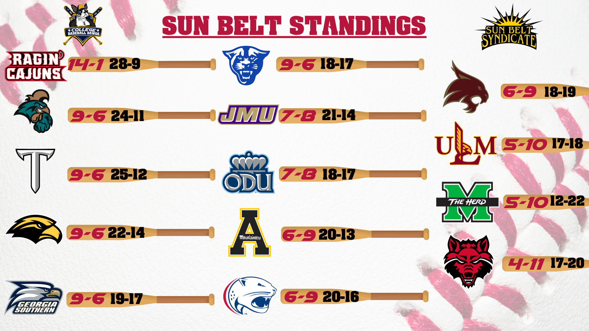 Yes, they've been on quite the ride BUT(!) their schedule is backloaded and they have yet to get to the meat of it. Let's see where they end up after weekend sets @ Coastal, vs USM, @ Troy, & @ Ga Southern. They end with South Al but even that isn't a gimme as they've taken a series vs UNCW & Troy with wins over Nebraska, Mississippi State, Alabama, & last night's 7 run victory over Tulane in New Orleans.