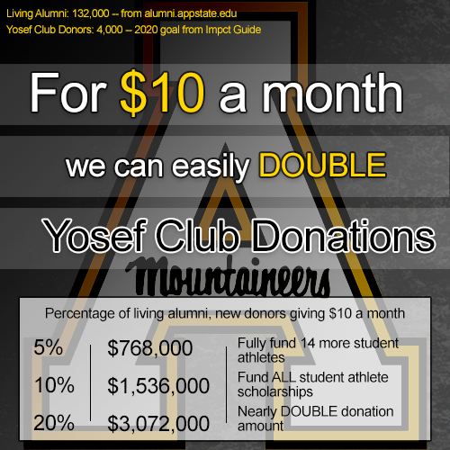 From a tweet today:scatman77 wrote: ↑Wed May 27, 2020 10:38 pmThanks, Chuck! As an added note to my post the Alumni Association notes that there are over 130,000 living alumni. $10/month/year X 130,000 = $15,600,000. Think about it.....asu66 wrote: ↑Wed May 27, 2020 12:22 pmJust sayin'...scatman77 wrote: ↑Wed May 27, 2020 11:37 amIn light of the recent news the past few days I want to encourage everyone to be sure to join the Yosef Club if you're not already a member. If you are a member encourage others who are not a member to join. The Former Athletes' Association is a part of Yosef as well. The FAA gets $30 of your YC membership to help us with: senior awards, letters, letter jackets, Hall of Fame breakfast and program, and the the athletic achievement recognitions at the APPSPYs Awards Banquet. Student-athletes, coaches, administration and staff all attend to applaud another year of accomplishments for the Mountaineers. If you are a former athlete be sure to note that on your membership when contacting the Yosef Club.