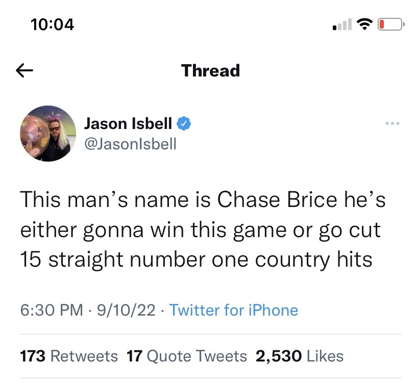 Chase is getting huge exposure after lighting up UNC and a solid A&M performance. I’m happy for the guy, he is a Mountaineer. He even made Jason Isbell’s Twitter, quite an honor indeed!!