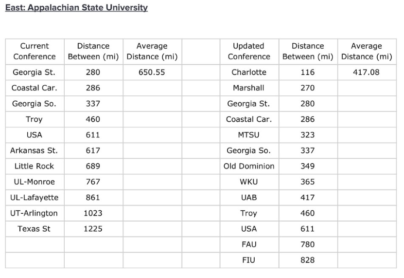 "Appalachian State’s average distance between current conference opponents is 650.55 miles. If the conferences realigned the average distance between its conference opponents would be reduced to 417.08 miles."