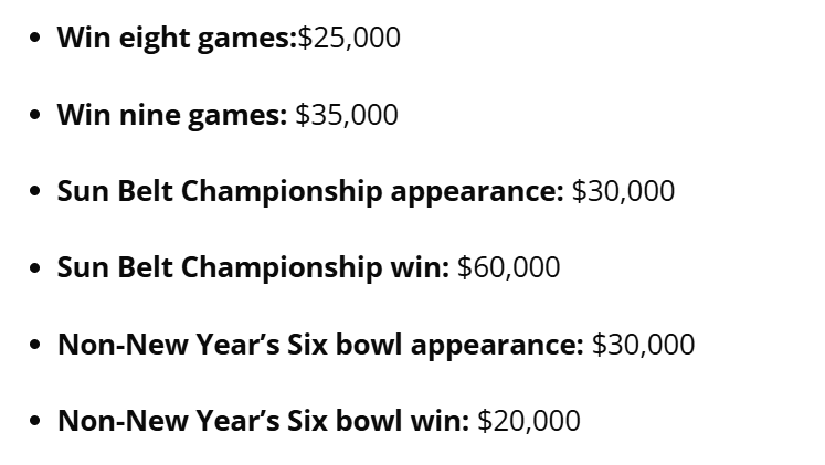 App looks to have saved $200k in missed incentives payouts. 40% of the buyout to Clark right there.AppStMike201 wrote: ↑Mon Dec 02, 2024 10:13 amThis is correct. Also, not sure if this has been posted before, but the link below provides an in-depth look at his contract. He's missing quite a few bonus targets this year that the program had to budget for in a best case scenario. The money saved by not having to pay those bonuses should factor into the decision.AppState222 wrote: ↑Mon Dec 02, 2024 8:19 amFun fact: Bowl game payouts are distributed to the conference who then distribute it evenly between all the schools in the conference. Instead of losing money going to bowls (travel, housing, food, etc) App actually probably comes out on the plus side by not making a bowl.