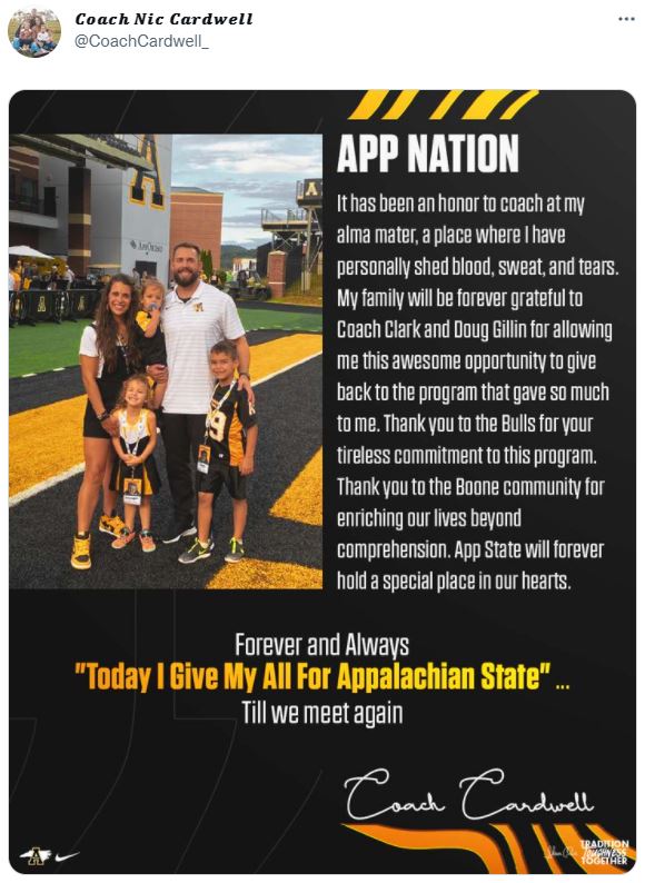 I'd gladly be open to giving Mario a chance at a position for App. Hung out with him a few times in college. Really cool and intelligent guy.TractorApp wrote: ↑Tue Feb 15, 2022 8:46 pmHope Mario Acitelli gets an interview. He was at LSU last year as an analyst. Did 3 years a Texas, one at UNC a couple each at William and Mary and Elon. Also can coach Special teams. My favorite App O-lineman. I think of him everytime anyone mentions the Michigan win.