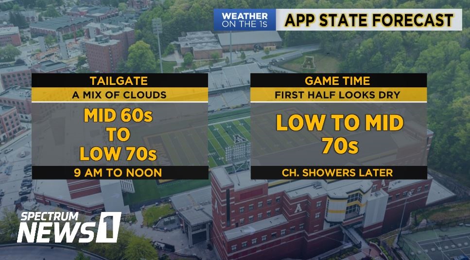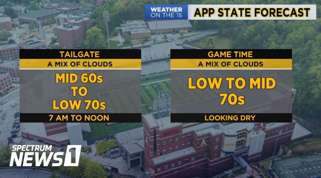 With the weather in Boone being what it is...plan for foggy and cool in the morning (can't see two feet in front of you), partly sunny and warm around game time (wear sunscreen), cloudy with a chance of rain by half-time (bring a poncho), and sleet and freezing rain by midnight (bundle up in parkas & gloves).