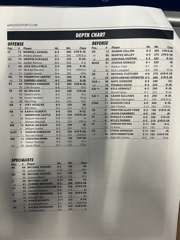 Basing it off the fact that 5 of those guys you mentioned totaled only 10.5 sacks last year. (Omitting the 6th for obvious reasons). That's not to say those guys don't get after the QB in other ways, such as QB hurry, QB Pressure, picking 2 OL to free up a rushing LB or DE stunt...etc. Someone out of those 5 will need to step up with some sacks alongside Nate- KAV might be my sleeper to do it!AppSt94 wrote: ↑Mon Aug 26, 2024 12:04 pmArnholt earned the designation but I don’t read much into the depth chart in terms who is out there play 1. Farrar could go out first depending on the personnel. I’m not sure what you are basing your comment on but we have a plethora of pass rushers. Fletcher, Collins, KAV, Kelly, Hopper and Wyatt can all get after the QB.311neers wrote: ↑Mon Aug 26, 2024 11:53 amNot too many surprises. Maybe the Gentry/Langlo battle but that means we've got competition!